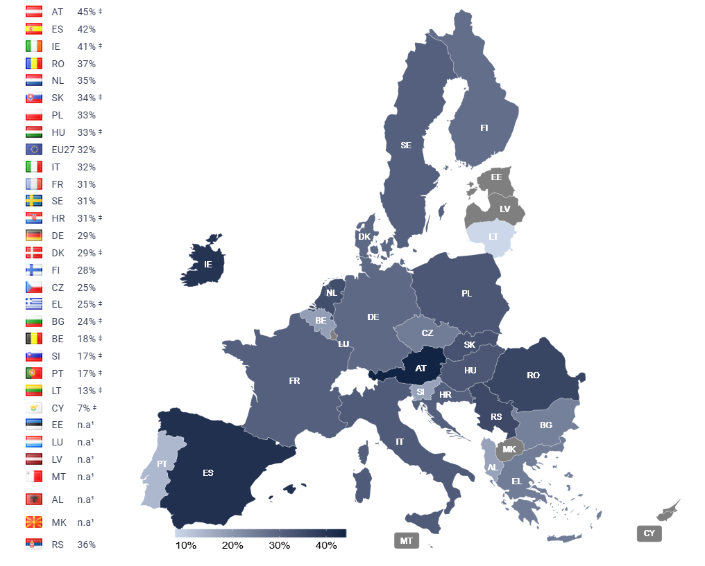 A map of Europe with different coloured countries/regions showing the prevalence of physical or sexual attacks experienced by intersex respondents due to being L G B T I Q in the past 5 years in all the 30 survey countries, the EU-27 average being 32%, the highest in Austria (45%) and the lowest in Cyprus (7%).