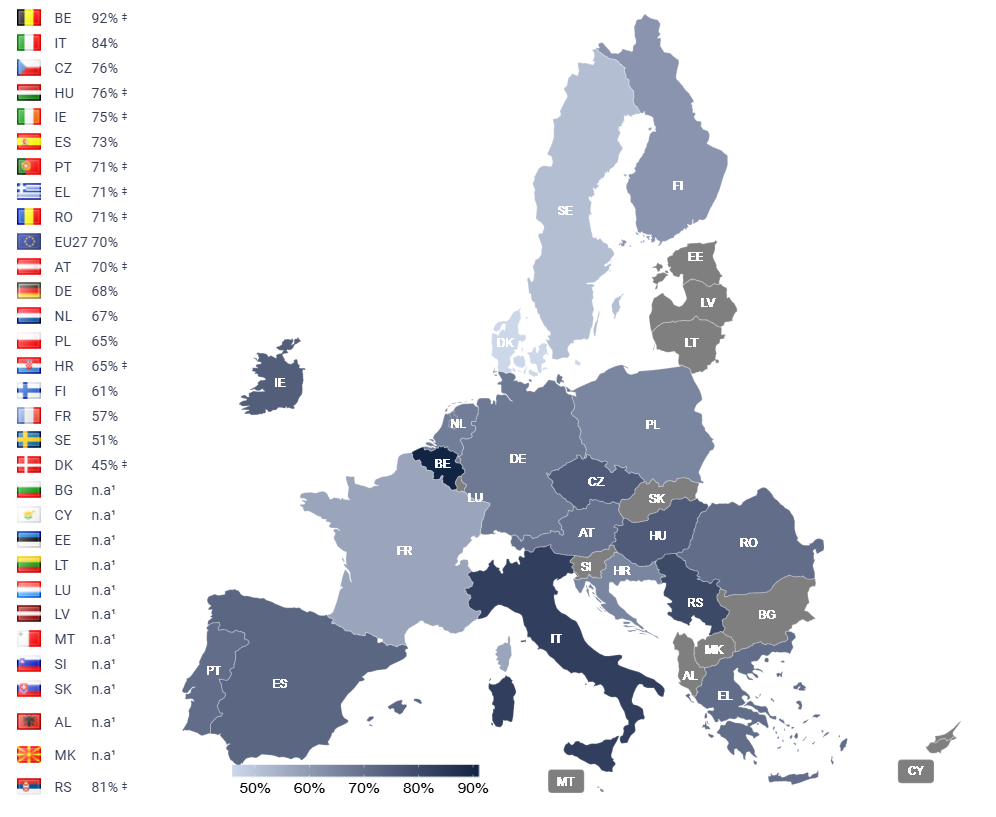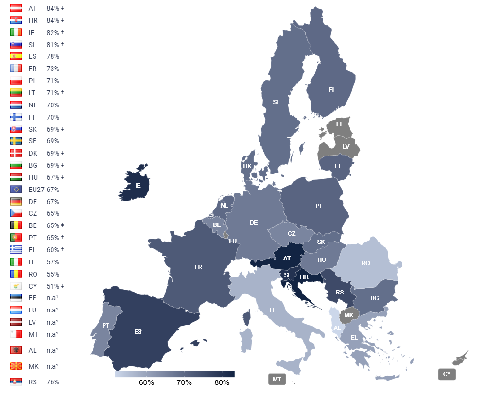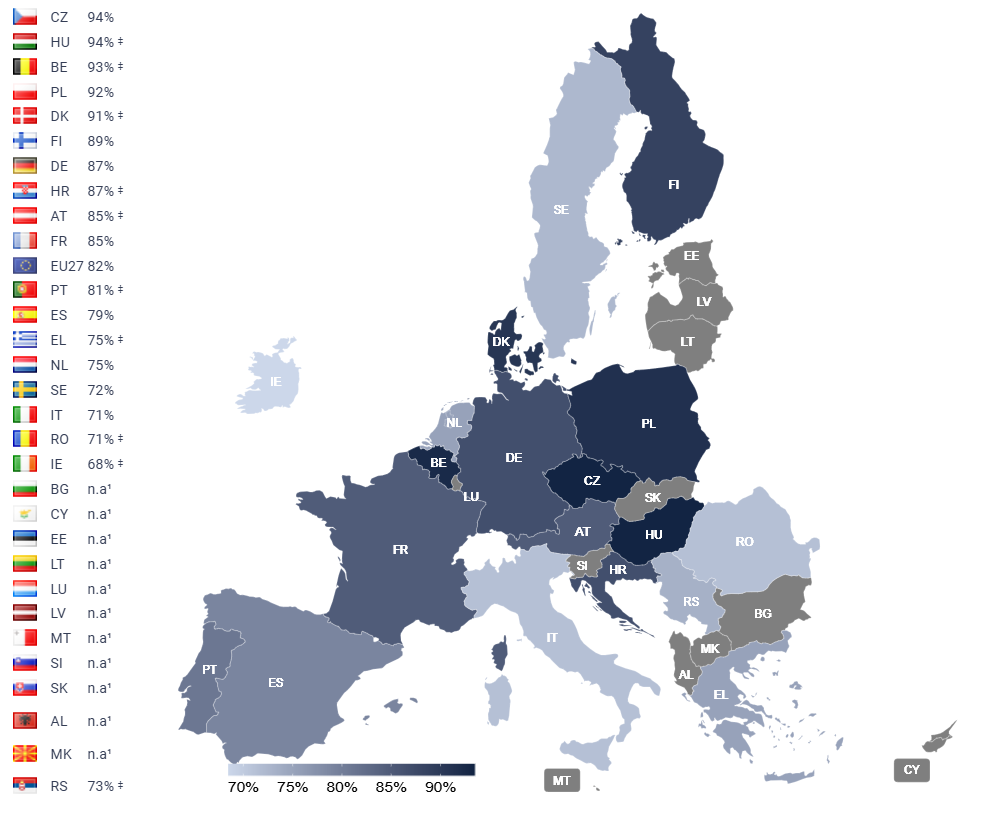 A map of Europe with different coloured countries/regions showing the proportion of intersex harassment victims who did not report the incident anywhere. The map shows in all the 30 survey countries, the EU-27 average being 82%, the highest in Czechia and Hungary (94%) and the lowest in Ireland (68%).