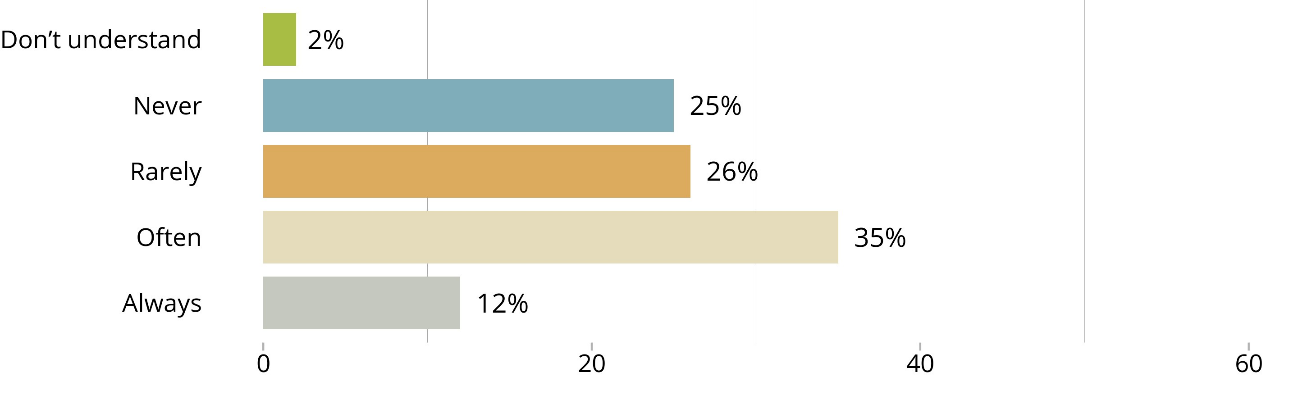 The survey found that intersex persons encountered online hatred campaigns more often than other LGBTIQ survey groups. This finding supports the hypothesis that some LGBTIQ groups are targeted more than others by online hatred and disinformation campaigns that aim at polarising and sowing divisions within European societies. Two thirds (67 %) reported often or always seeing online references to LGBTIQ propaganda or gender ideology, while 69 % have, with the same frequency, seen references to LGBTIQ people posing a threat to ‘traditional values’ and 66 % have seen campaigns considering LGBTIQ people to be ‘unnatural’ or mentally ill.