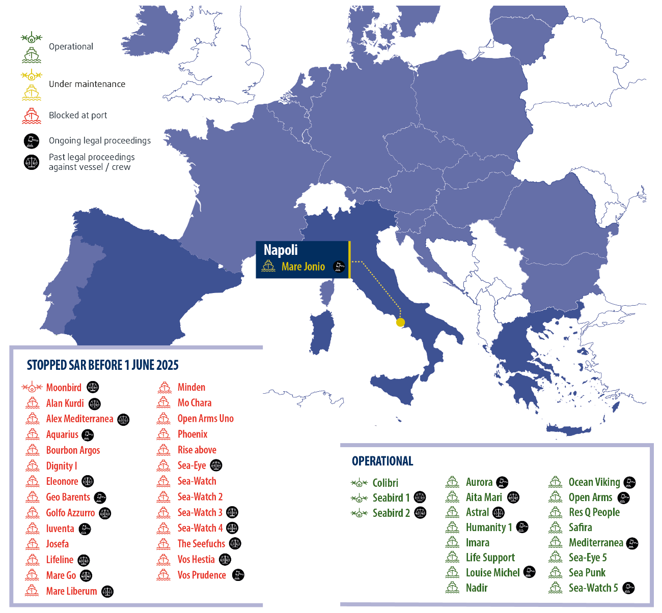 As of 1 June 2025, 17 vessels and three aircraft were still deployed; the rest had discontinued operations. One of the deployed vessels was under maintenance (Mare Jonio).